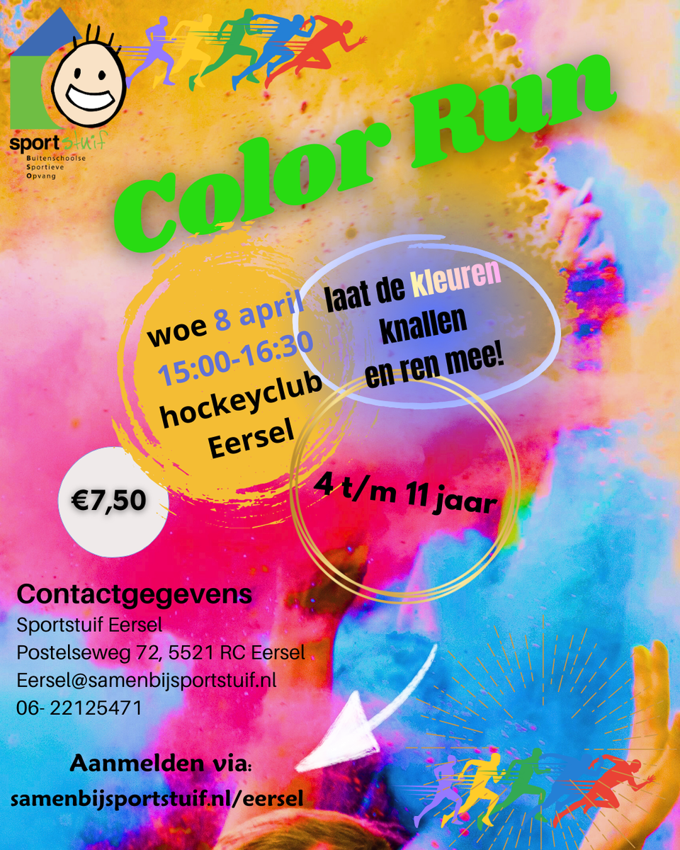 Eerste editie Color Run in Eersel! đ Op woensdag 8 april is het eindelijk zover: de allereerste Color Run in Eersel! đââī¸đ Een vrolijk en kleurrijk evenement waar plezier, beweging en avontuur centraal staan. Deze speciale run is speciaal georganiseerd voor kinderen en belooft een middag te worden om nooit te vergeten